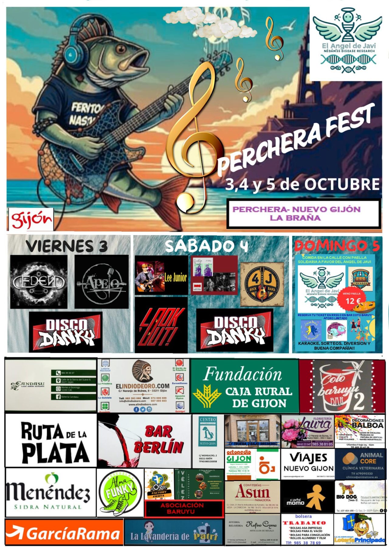 Nuevo Gijón, La Braña y Perchera celebran este fin de semana el Perchera Fest, un multitudinario evento musical pensado como iniciativa solidaria en favor de la plataforma El Ángel de Javi. La cita incluirá actuaciones de artistas como Eden, Look Out, Apelo o Disco Danky, así como un almuerzo dominical de hermandad. Toda la información puede consultarse aquí.