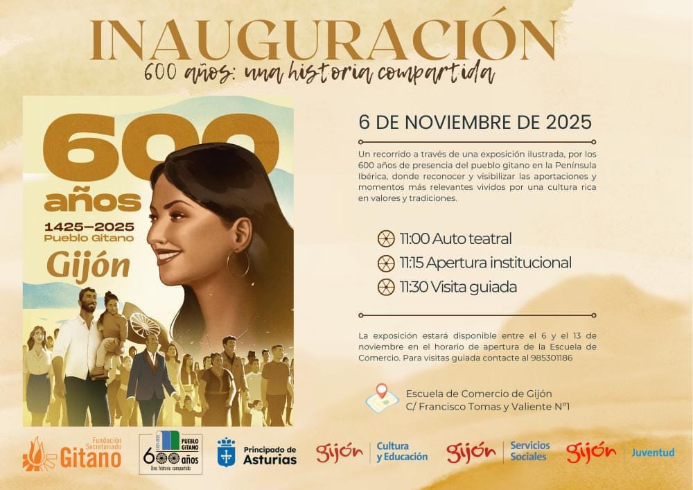 Coincidiendo con los primeros seis siglos de la presencia gitana en suelo español, la Fundación Secretariado Gitano inaugura este jueves en la Antigua Escuela de Comercio de Gijón la exposición ‘600 años: una historia compartida’, que ofrece a los visitantes un recorrido a lo largo de esa dilatada historia. Los contenidos recogidos en dicha muestra permiten aproximarse a la cultura, los valores, las tradiciones y las aportaciones de la comunidad gitana en ese tiempo, así como conocer de primera mano sus hitos más destacados. El acceso es libre y gratuito, y es posible concertar recorridos guiados llamando al teléfono 985 301 186.