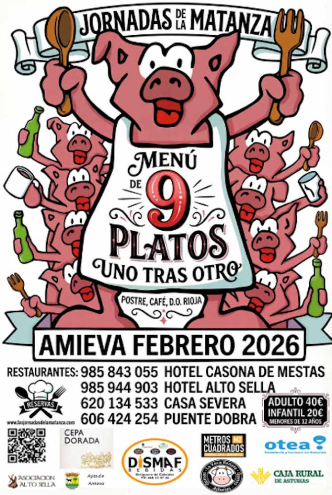 Declaradas Fiesta de Interés Turístico del Principado de Asturias, las Jornadas gastronómicas de la matanza reúnen a hosteleros de Amieva y el Alto Sella en torno a la tradición culinaria del cerdo. Los menús incluyen productos típicos como sopa de hígado, pote de berzas, boroña, manos de cerdo, callos, boronzu, lengua, picadillo y lomo. Una propuesta que combina gastronomía tradicional y promoción del entorno rural.