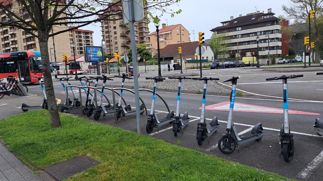Patinetes estacionados en Jesús Revuelta Diego, a la altura del parking del Grupo Covadonga. / miGijón