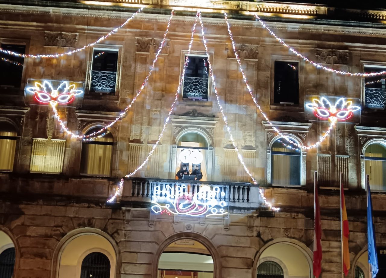 La llegada a la Plaza Mayor fue apoteósica y el estruendo de los tambores acompañó a la Sardina Perlamari en su salida al balcón. Y desde lo más alto, presentó a ‘Horariu de Branu y Horariu d’Iviernu’ (horario de verano y horario de invierno), los pregoneros de esta edición, dos grandes relojes de pared que discutieron si era bueno o no esa hora de diferencia que nos hacen cambiar según sea verano o invierno.