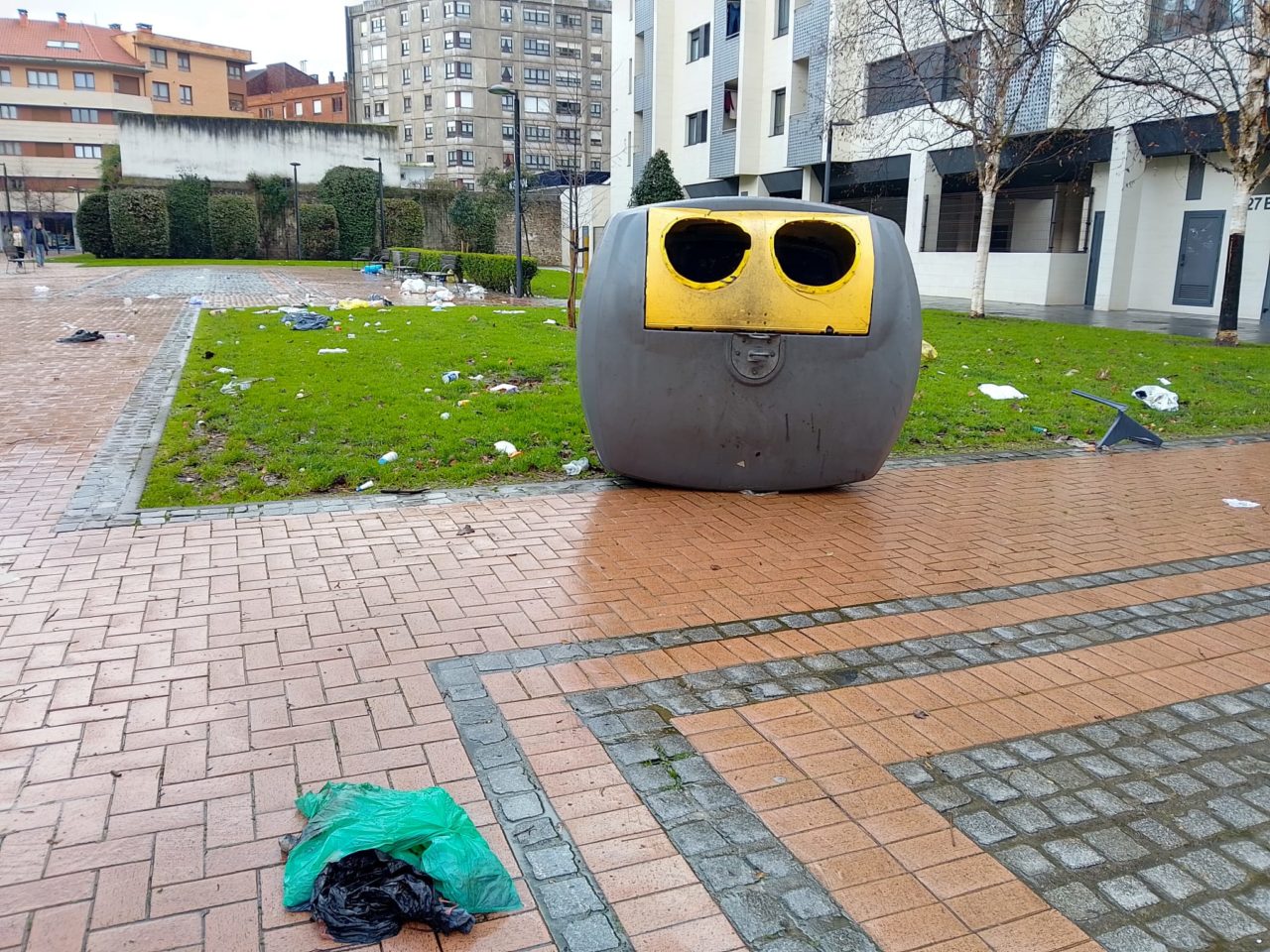 Contenedor de reciclaje desplazado y volcado por el viento ayer en Laviada. / Leticia Blas
