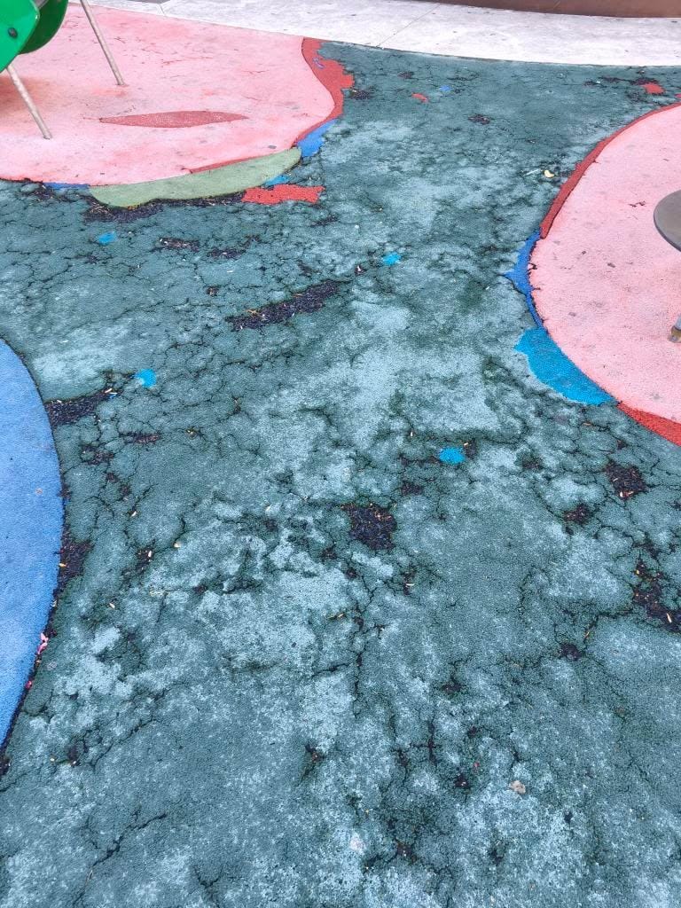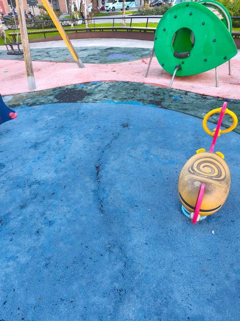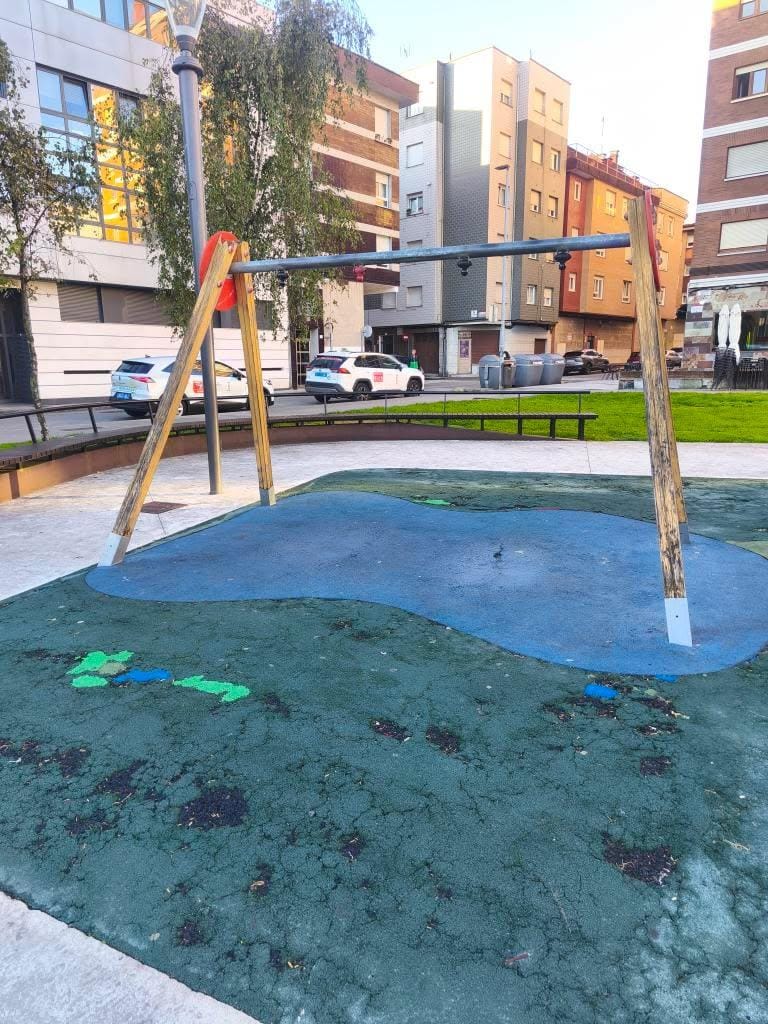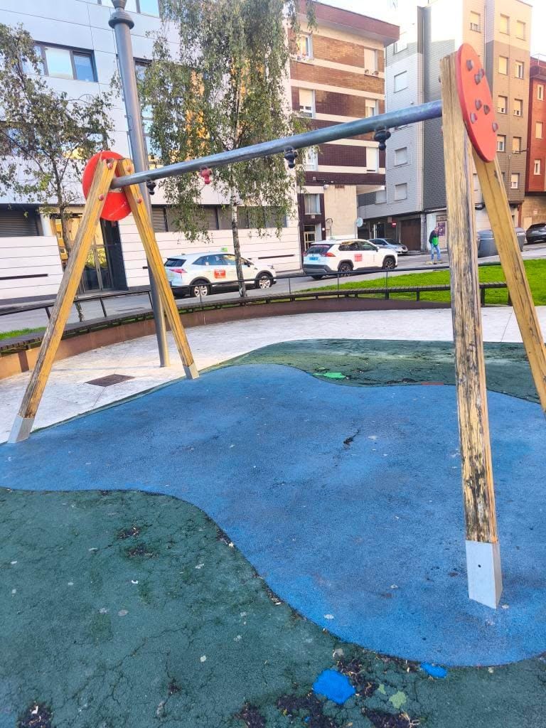 Ya sólo el aspecto del suelo de gomaespuma da testimonio de esa decadencia. Las planchas multicolores, en otro tiempo impolutas, lucen desgastadas, con algunos cortes y socavones aquí y allá, y ennegrecidas por la suciedad. Una pátina oscura similar cubre los distintos juegos instalados en el parque, como los balancines o la cabaña infantil, y es probable que lo mismo ocurriese con los columpios… De no ser porque, directamente, no están. El soporte sobrevive, sí, y a la vista está, pero tanto los dos asientos como los cuatro juegos de cadenas para sostenerlos han desaparecido. Una presencia parcial que sirve de muda demostración de lo que la zona de juegos fue en otro tiempo, pero ya no es.