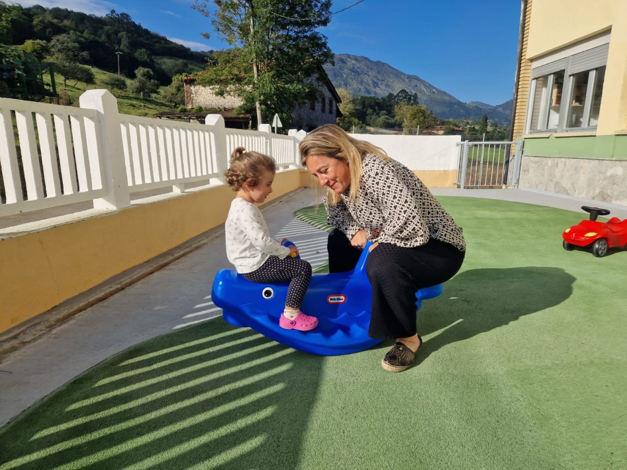 La exconsejera de Educación, Lydia Espina, con una niña en el patio de la escuelina La Brañona, de Panes, en una foto de archivo de septiembre de 2024/Principado