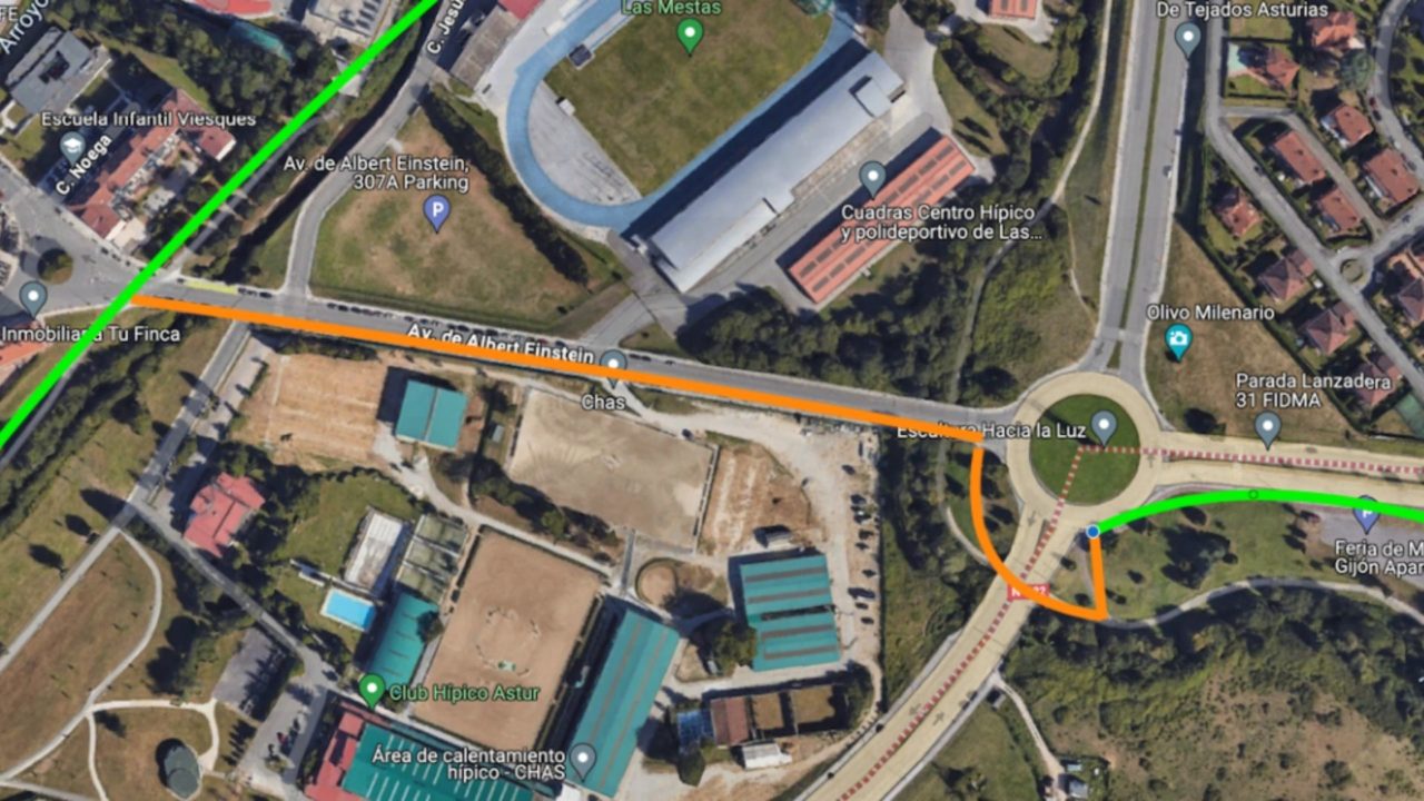 Una de esas vías es la Av. Albert Einstein, una calle, prácticamente una carretera, que lleva mucho tiempo con unos baches que prácticamente te impiden ir en bici o VMP con seguridad por ella, además de en coche. Esta vía es importante y muy concurrida. Aparte de ser una salida del barrio de Viesques hacia la autopista, es también la conexión natural de la ciudad ,y de barrios como El Coto, Ceares o Viesques, con el entorno de la Milla del Conocimiento. (nombre feo con ganas), y al revés. Es decir, la parte de la ciudad que prácticamente está mirando hacia esa zona y cuya distancia en bicicleta es más que asequible.
