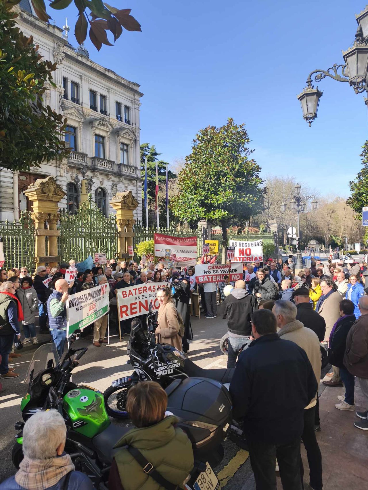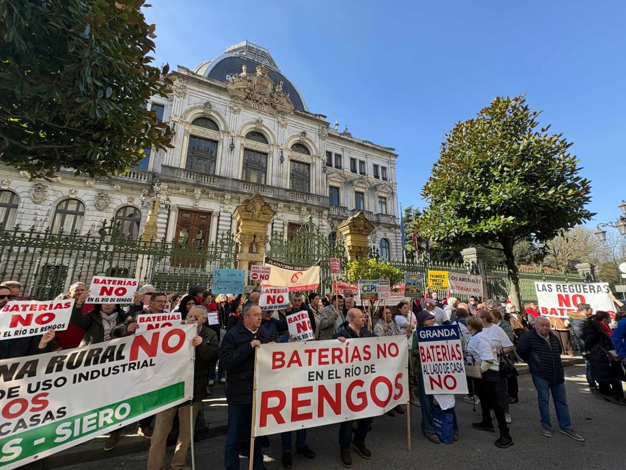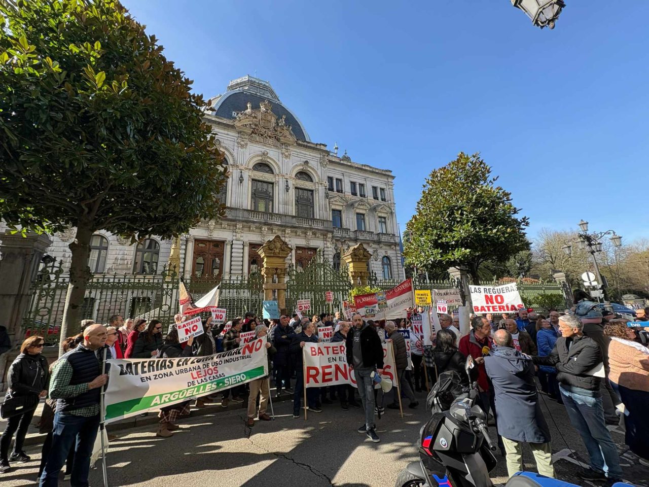 El pulso que el Gobierno del Principado y una parte de la población asturiana mantienen por el espinoso asunto de la proliferación de parques de baterías en la región volvió ayer sábado a visibilizarse en las calles. Decenas de personas respondieron al llamamiento lanzado por la plataforma Stop Baterías Asturias, y se concentraron ante la sede de la Junta General para exigir al Ejecutivo un marco legal claro que, en esencia, impida la instalación de tales espacios de almacenamiento cerca de áreas habitada, espacios protegidos y otras zonas críticas. Una demanda muy oportuna a tenor de que, en este momento, hasta diez nuevos parques han obtenido la autorización de construcción. Eso sí, horas después de la cita el consejero de Ciencia, Industria y Empleo, Borja Sánchez, confirmaba a los medios que la cuestión será debidamente revisada.