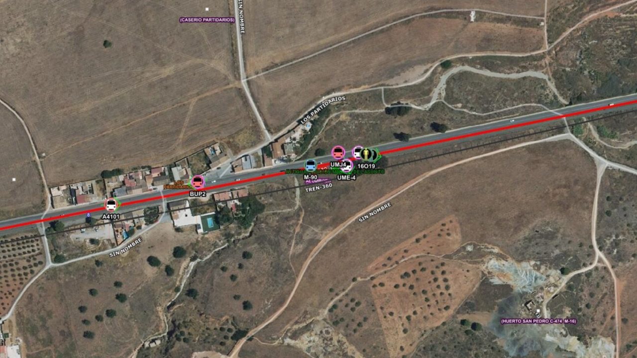 Mapa en el que se muestran el punto de la colisión, y las diferentes unidades de emergencias desplegadas para asistir a los afectados. / 112 Murcia