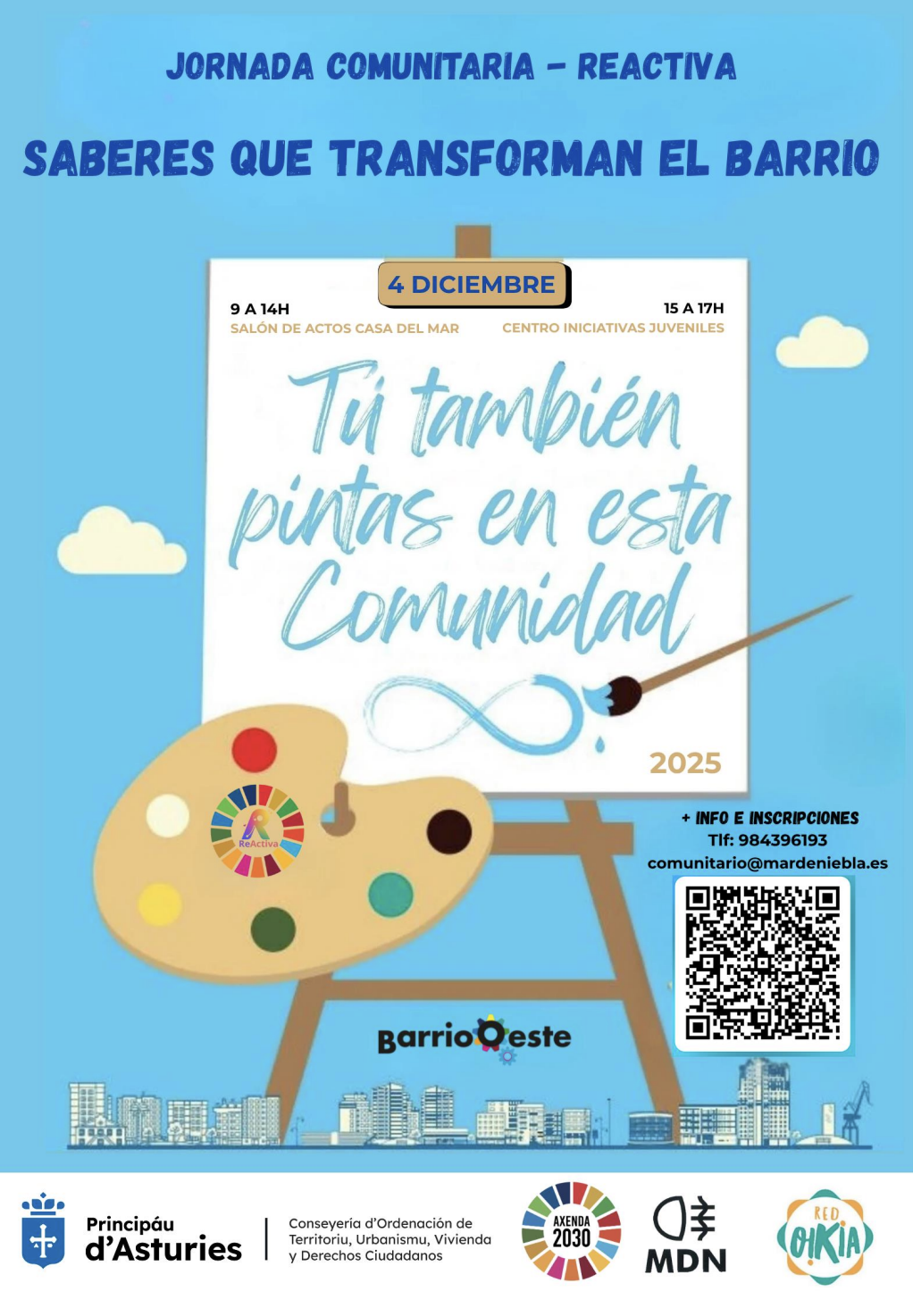 El barrio Oeste de Gijón se prepara para celebrar, este jueves 4 de diciembre, una nueva edición de la Jornada Comunitaria Reactiva, un encuentro que busca poner en valor los saberes locales, recuperar la memoria del territorio y activar nuevos proyectos comunitarios. Bajo el lema “Tú también pintas en esta comunidad”, la cita está organizada por la Fundación Mar de Niebla, con el apoyo de la Consejería de Ordenación del Territorio, Urbanismo, Vivienda y Derechos Ciudadanos, la Dirección General de Agenda 2030 y la Red Oikia – Red para la Promoción del Desarrollo Comunitario, tal y como recoge el programa oficial.