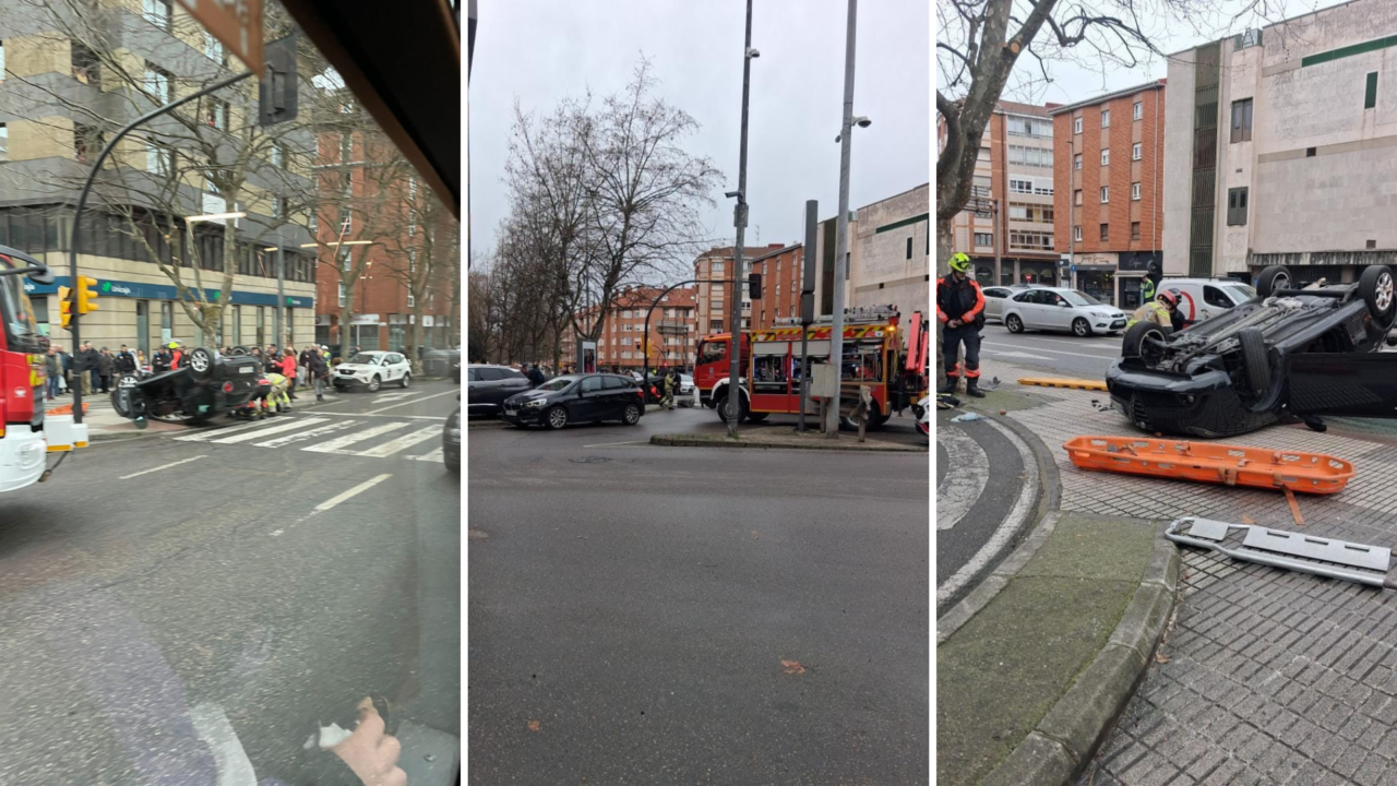Un espectacular accidente deja un coche volcado y un herido en Cuatro Caminos