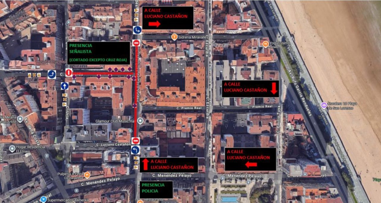 Los vehículos que circulen por la vía deberán desviarse por La Playa hasta El Muro, a la avenida Rufo García Rendueles, para, allí, poder seguir por Emilio Tuya y coger Menéndez Pelayo. Se permitirá el giro en Marqués de Casa Valdés, en dirección contraria al sentido habitual del tráfico, para acceder a Luciano Castañón. Mientras, los que circulen por Adosinda serán desviados obligatoriamente por Uría, excepto los vehículos de emergencia a Cruz Roja.