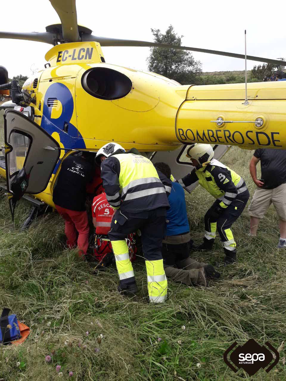El equipo de rescate continuó con la atención sanitaria del afectado, para a continuación pasarlo al colchón de vacío, para su posterior traslado al helicóptero y así iniciar su evacuación al HUCA. La sala del 112 del SEPA informó del suceso a la Guardia Civil y al Servicio de Atención Médica Urgente (SAMU) que activó la UVI Móvil, al médico y una ambulancia de la zona.