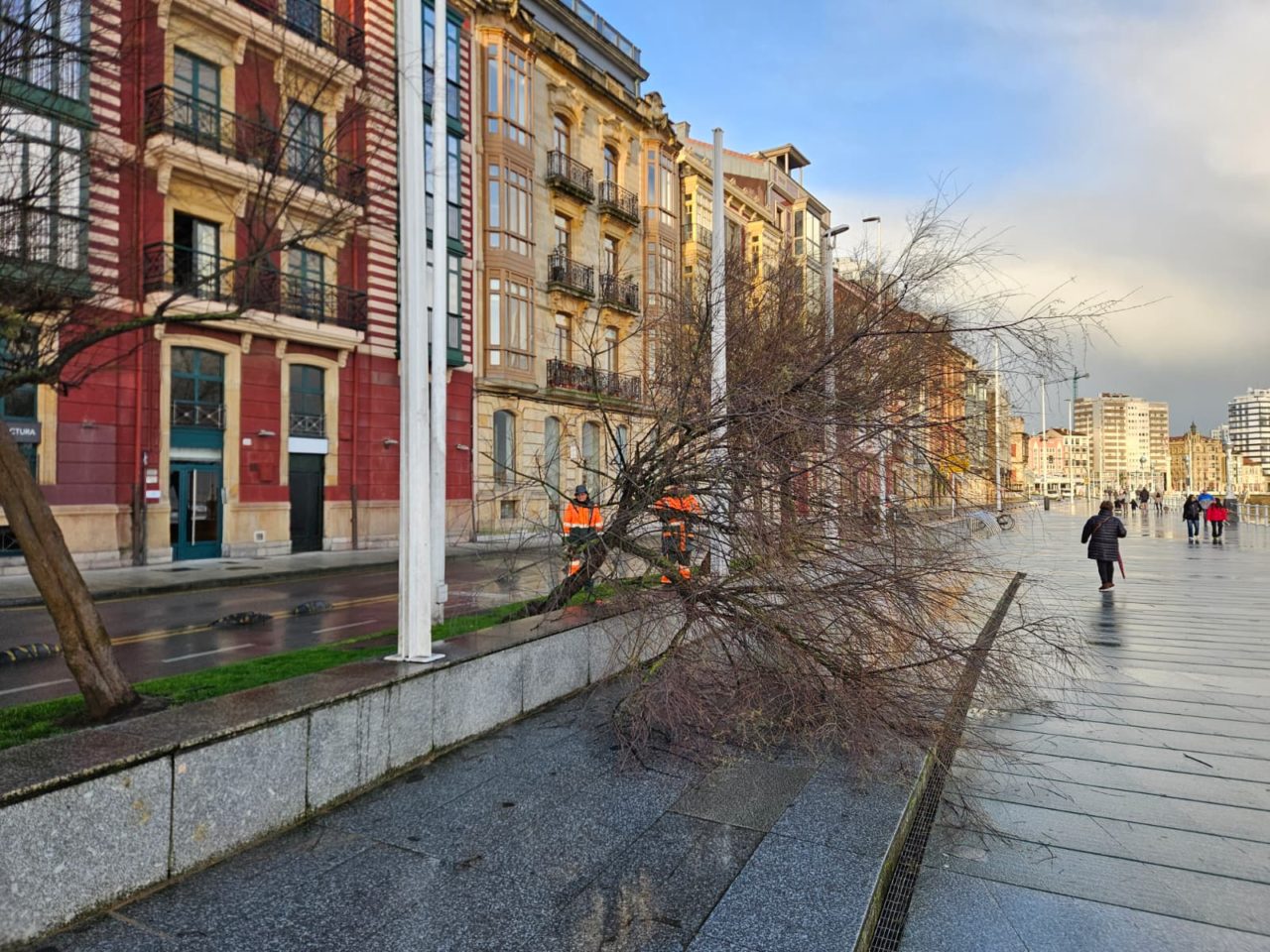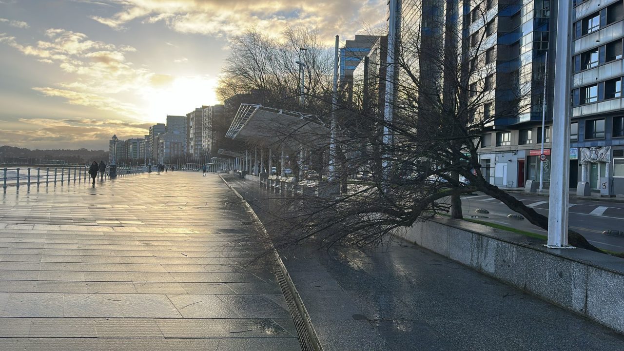 No es que la pasada haya sido una noche particularmente ventosa en Gijón. Sí, ha habido alguna que otra racha fuerte, pero ni comparación con las dejadas por las recientes borrascas que han azotado Asturias. Por eso, a muchos vecinos y visitantes les ha sorprendido encontrarse esta mañana uno de los tamariscos (Tamarix gallica) que jalonan el Muro de San Lorenzo parcialmente derribado. El ejemplar, situado a la altura de la escalera 6 y grotescamente tumbado sobre el murete que separa el área peatonal de las zonas ajardinadas, fue arrancado de raíz por las corrientes; cosa curiosa, como se ha dicho, de no ser porque ante su ubicación se halla la calle Eladio Carreño. Así, las primeras hipótesis extraoficiales apuntan a que la ubicación de dicha calle, unida a lo estrecha que es y a la abundancia de edificios, la convirtieron en un auténtico ‘túnel de viento‘, en el que la velocidad de las rachas se multiplicó, propiciando la caída del árbol. Además, conviene matizar que las raíces de este último no son, ni mucho menos, las más grandes y recias del reino vegetal.