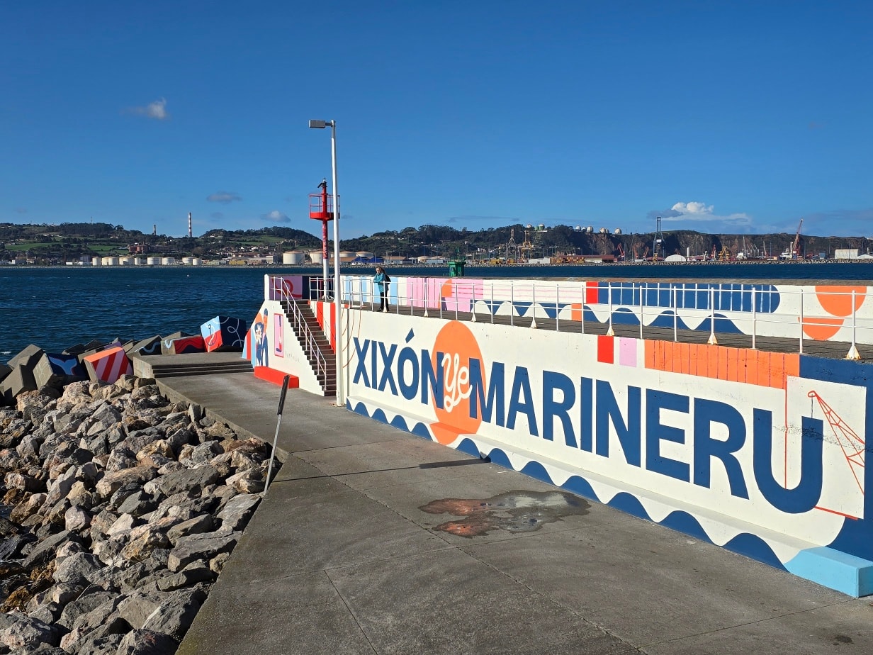 El mural está dominado por un lema rotundo, “Xixón ye marineru”, que resume la relación histórica y emocional de la ciudad con el mar. A partir de esta declaración, los artistas han desplegado una composición que integra imágenes vinculadas al puerto y su entorno, desde referencias a la actividad marítima hasta guiños al paisaje costero y a la cultura local. La obra, de gran formato y visible desde distintos puntos del paseo del dique, busca convertirse en un símbolo reconocible para vecinos y visitantes.