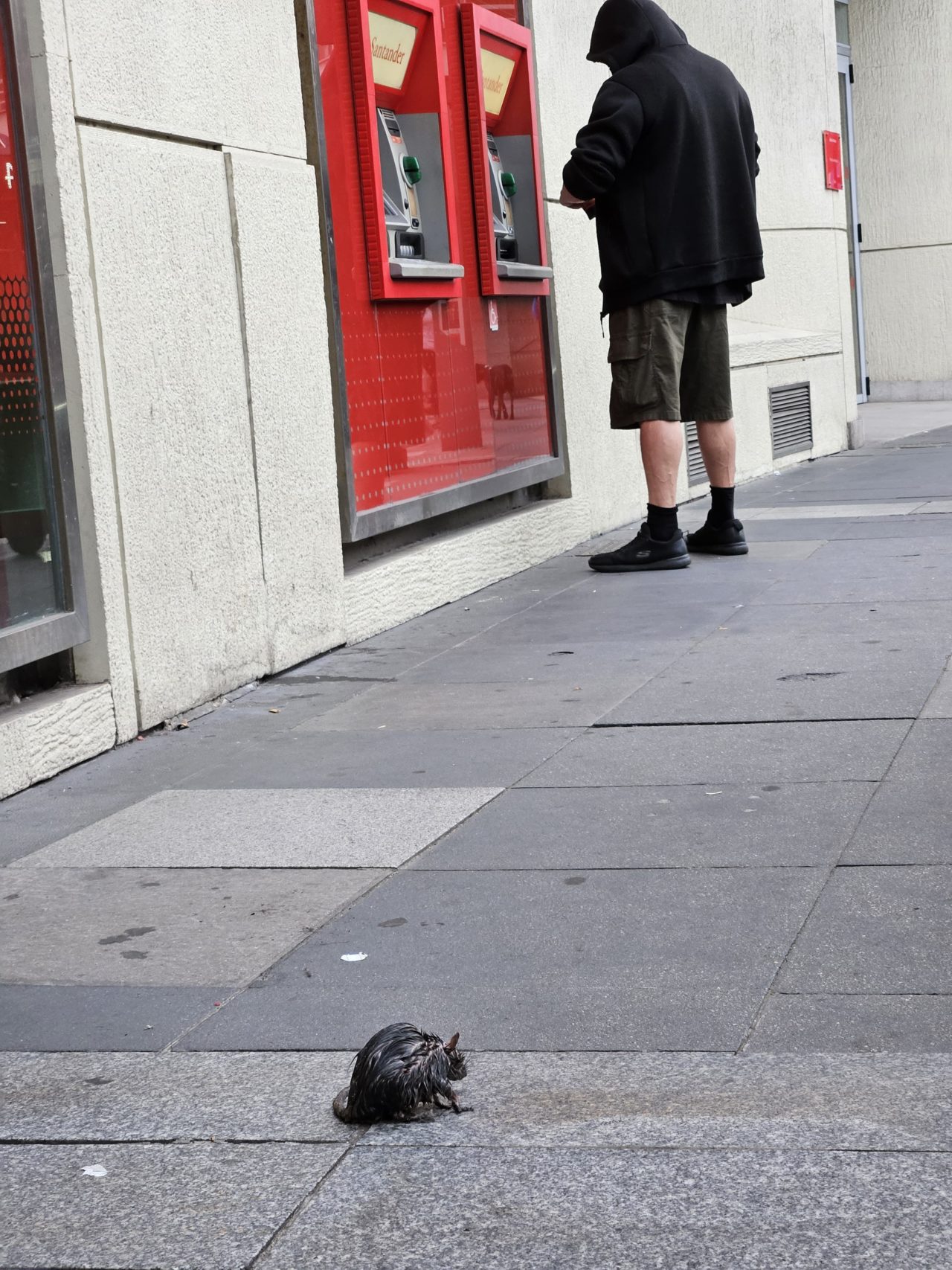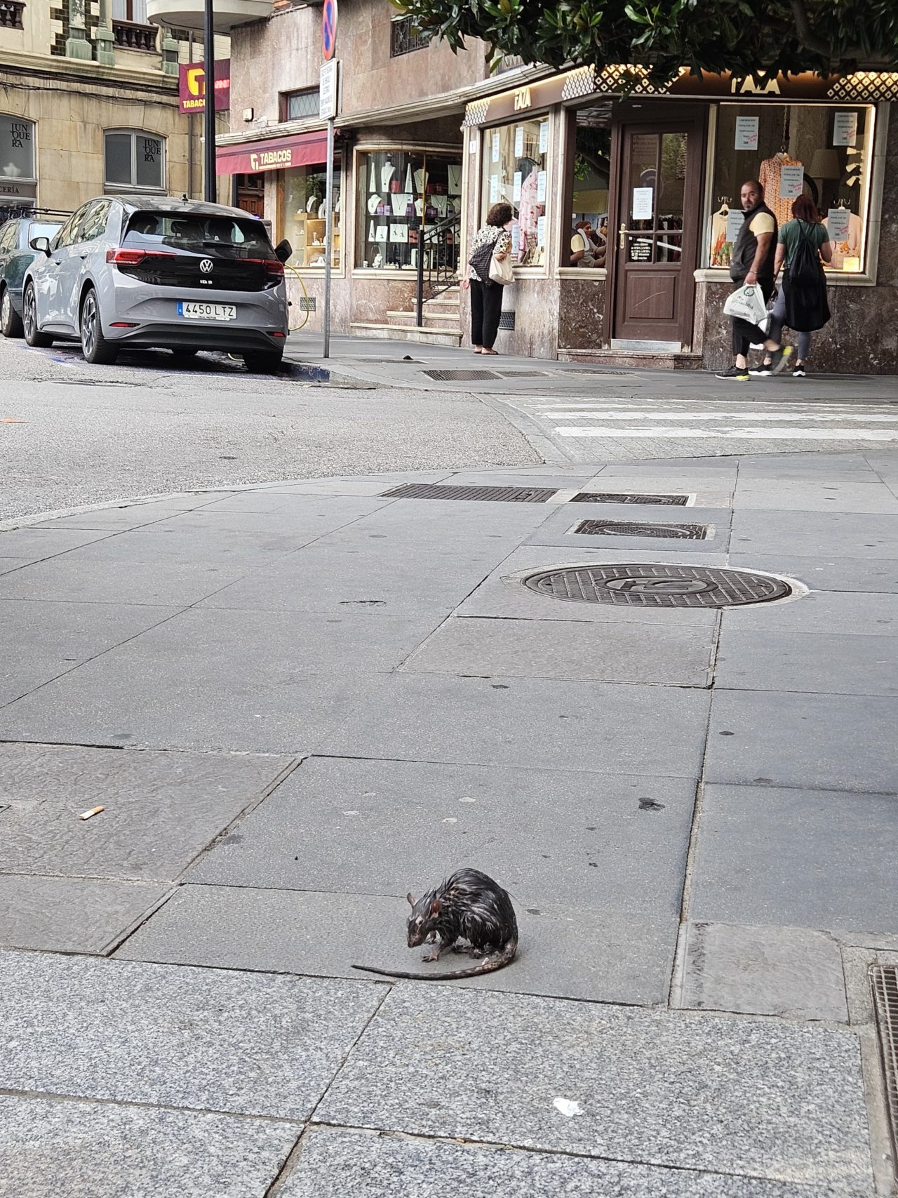 La de Gijón con las ratas es una relación larga, profundamente familiar y… Digamos… ¿Incómoda? Seamos francos: sea por mero prejuicio o fruto de temores reales, al ciudadano promedio no le hace demasiada gracia convivir con tales roedores, una certeza que choca frontalmente con el hecho de que, en la ‘villa de Jovellanos’, su presencia se haya convertido en algo cotidiano. Lo visto este misma lunes en la plazuela de San Miguel, en pleno centro de la urbe, así lo confirma. Con los relojes marcando las ocho y veinte de la mañana, varios transeúntes y repartidores, estos últimos enfrascados en la carga y descarga de sus mercancías, quedaron sorprendido al ver a una rata de notables dimensiones, empapada tras haber abandonado una alcantarilla, deambular tranquilamente en el enlace de la calle Capua, a pocos metros de la sucursal del Santander. Y ni un ataque de pánico, ni un grito de terror, ni una carrera intempestiva… Por ninguna de ambas partes. Porque hasta el animal, demostrando un aplomo increíble, se quedó plácidamente en la acera, tal vez aturdido, pero lo suficientemente avispado como para esquivar a los peatones sin precipitarse, merodeando los alrededores del banco y observando con atención a quienes, como A. V., autora de la imagen, retiraban dinero de los cajeros. ¿Quizá estaba empezando a desarrollar un cierto apetito por el vil metal…?